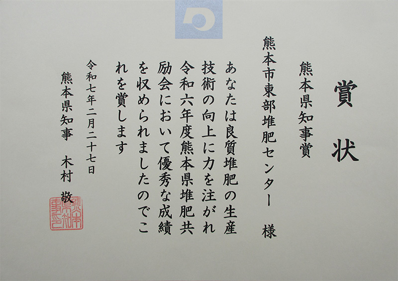 令和7年2月27日、東部堆肥センターで製造している「くまもとeco牛ふん堆肥」が「令和6年度熊本県堆肥共励会(熊本県耕畜連携推進協議会主催)」の熊本県知事賞を受賞しました。